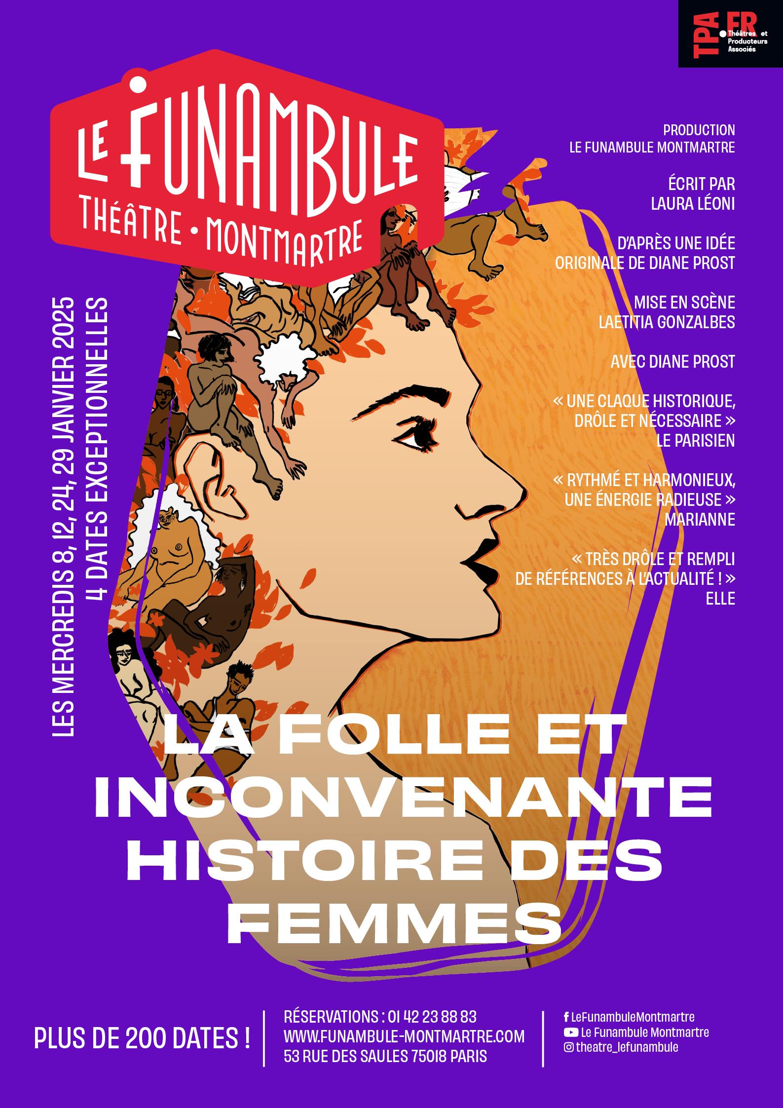 Une heureuse piqûre de rappel ! Et oui, j'y suis revenue sur cette folle et inconvenante pièce et surtout pour revoir cette piquante comédienne, au talent affirmé et à ce jour, au talon fragile...Quel professionnalisme et quel courage pour mener la" dense" histoire des femmes. La projection vidéo est un petit régal, Diane joue du voile comme personne ,de la robe à la culotte ça ne fait pas un pli. J'ai beaucoup apprécié la citation de Joséphine Baker dont la personnalité, le courage, méritent qu'on s'en souvienne ! J'ai pour cette femme de cœur, une admiration XXL. Sœurs au combat, Amazones, pionnières, vous toutes de part le monde et à travers les âges...Diane vous offre la lumière et porte vos voix avec intelligence et incarnation, c'est à la fois drôlement et tristement décapant...la condition des femmes ! Un seul en scène drôle et intelligent, engagé avec une comédienne qui en a sous la jupe, si je puis me permettre.