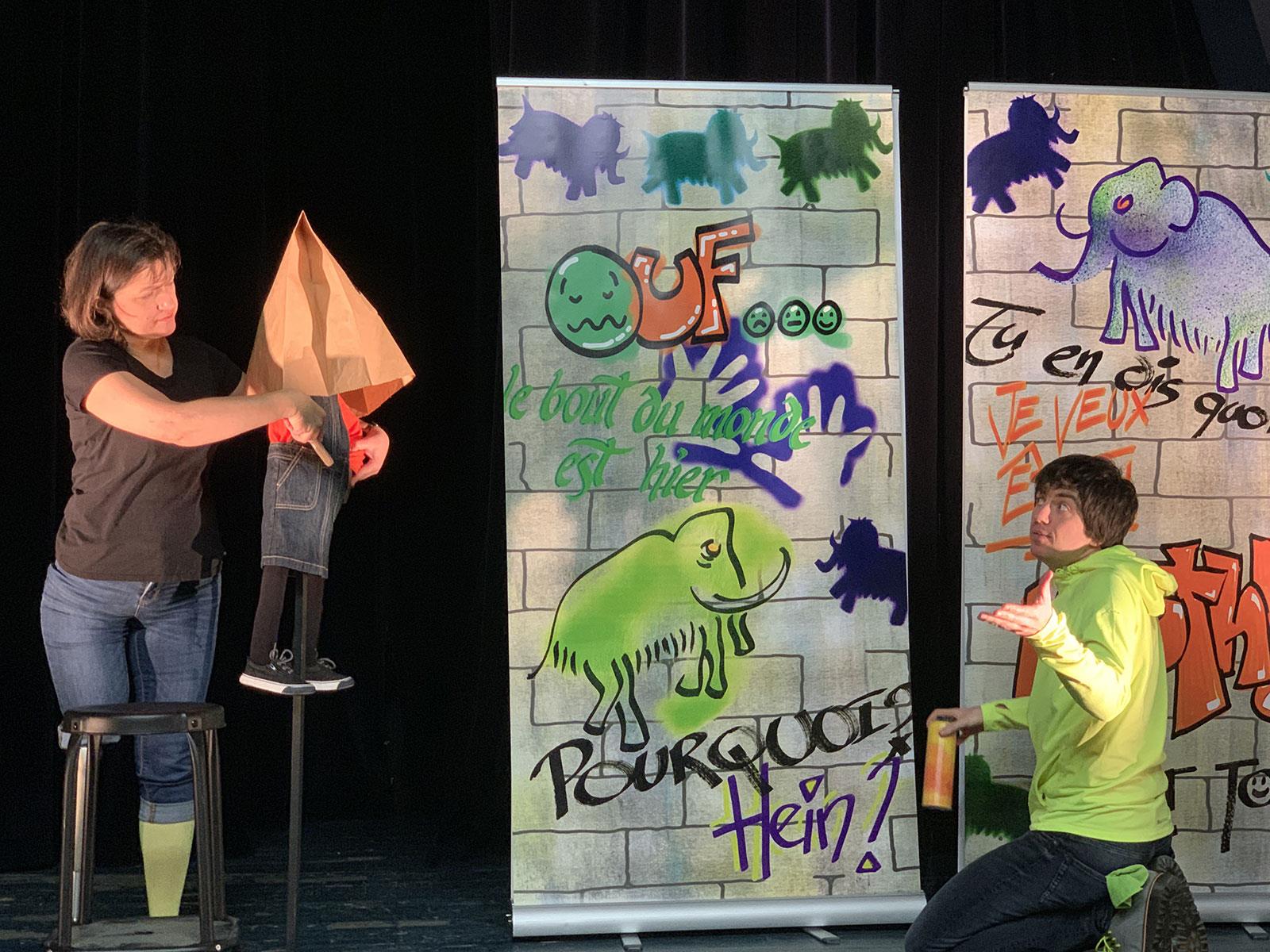 Au-delà des murs, des graffitis et du béton de la ville se cache un monde merveilleux où l’herbe chante, le ciel est jaune et certains mammouths… ont des plumes ? Dès 3 ans.