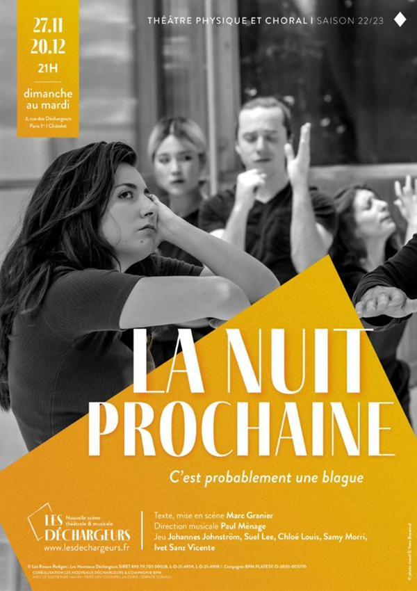Bien sûr, les scènes à proprement parler sont là pour détailler le drame d’Ana, montrer comment elle s’en sort (ou pas) ou encore apporter unhumour et une ironie du quotidien que nous affectionnons particulièrement. Mais tout cela ne prend pleinement son sens que dans le lien entre les corps,les voix et la ferme intention d’Ana de s’accrocher à la vie. C’est de la rencontre entre fil ténu d’Ana et fil tendu du chœur qu’est née La nuit prochaine.