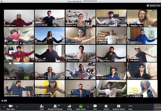 Le spectacle se passe comme une visio-conférence sur Zoom. À l’heure de la représentation, les spectateurs se connectent grâce à un lien que leur a envoyé le théâtre. Ils peuvent se connecter avec un ordinateur où qu’ils soient, et sont accueillis par les comédiens qui sont, eux aussi, chacun dans un endroit différent (chez eux ou à l’hôtel s’ils sont parallèlement en répétition pour d’autres projets). La représentation se déroule en temps réel avec les spectateurs qui, s’ils le souhaitent, restent visibles à l’écran. C’est une expérience très forte de voir tous ces visages, de sentir que nous pouvons nous rencontrer et interagir avec cet outil numérique. Il ne s’agit pas d’essayer de reproduire les conditions d’une représentation en salle, mais de partager une expérience théâtrale multi-située, écranique, et parfois un peu chahutée puisque chacun est responsable de son image et de son ordinateur, avec tout ce que cela implique, que ce soit au niveau du traitement de l’image ou de la voix, des mails et des appels qui arrivent soudain, et du partage de son espace privé avec l’espace du spectacle. A la fin de la représentation, je propose au spectateur une discussion avec l’équipe pour revenir sur leurs expériences. Nous ouvrons aussi d’autres salles sur Zoom pour les spectateurs qui auraient envie de bavarder entre eux, comme au foyer d’un théâtre.
