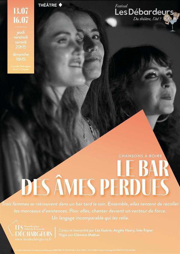 Ce spectacle de chant réunit trois jeunes chanteuses aux voix à la fois distinctes et complémentaires. S’il n’y a que des reprises de chansons qui nous ont déjà trotté à l’oreille, la composition des arrangements, transpositions et accompagnements (harmonies, polyphonies, piano, looper) sont de leur création. À travers l’histoire de ces femmes, s’opère une redécouverte de plusieurs générations de chanteuses : Piaf, Jeanne Moreau, Dalida, Anne Sylvestre, Carmen Maria Vega, Juliette, Barbara Weldens… Sans être un cabaret, ce spectacle chanté va puiser dans les registres scéniques qui fondent ce genre : reprises, transformation des textes, numéros avec objets, service de boisson, ou encore effeuillage. Le bar des âmes perdues cherche à décaler ces éléments pour venir servir l’histoire de ces femmes, dévoilant la poésie de chacune.
