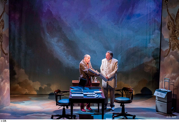 Textes plats, basés sur des calembours de premier étage. La pièce n’est finalement qu’Une seule restospective de la création de l’univers selon les textes bibliques, Elle se limite en outre aux images les plus banales. Le tout ne présente Aucune profondeur alors que le sujet le permettait. Les singeries de Denureau, qui tente pitoyablement d’imiter De Funès, sont lourdes et mal venues. Balmer n’a aucun souffle et sa voix, faiblarde, donne de Dieu une image bien famélique. Ennui terrible
