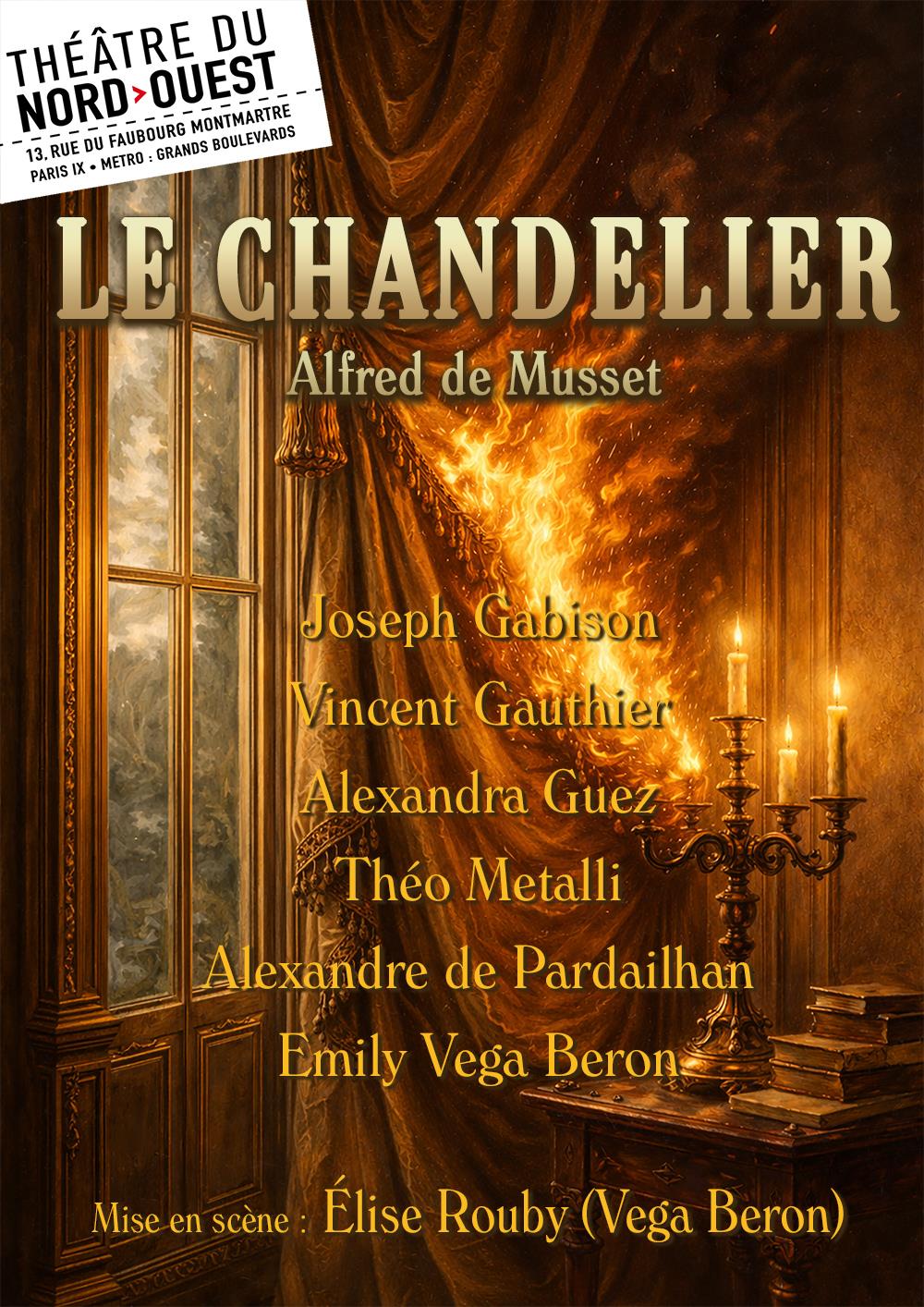 Dans Le Chandelier, Musset, sous les dehors d’un vaudeville, tend un miroir dérangeant. Fortunio, fou amoureux de Jacqueline, lui offre son âme sans savoir qu’il endosse le rôle du « chandelier » : celui qui attire les regards pour que les amants puissent s’aimer dans l’obscurité… ou peut-être pour mettre leurs vices en lumière…