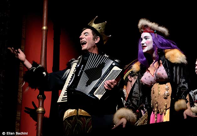 Les six comédiens sont musiciens. Le premier acte est terrible. Nous sommes en Bohême. La musique est bohémienne, gitane, toujours grave, parfois lourde et triste, parfois tango de tubas, parfois hitchcokienne. On pense à la Transylvanie.