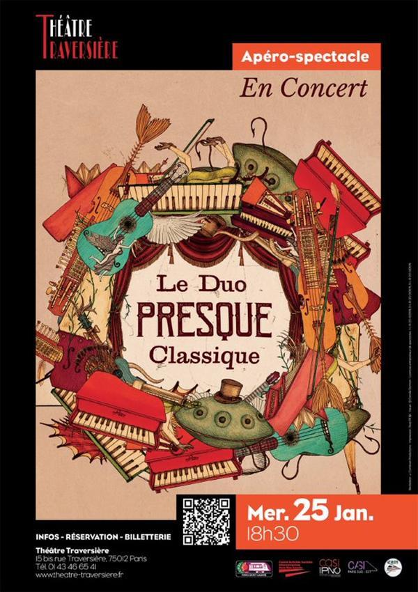 Déguster de petites formes musicales dans le cadre chaleureux du bar du théâtre, autour d’un apéro partagé, ça vous tente..? ce sont les « apéro-spectacles » du théâtre Traversière. Et pour inaugurer le cycle, rendez-vous, le 25 janvier, avec Le duo presque classique ; ou quand la grande musique s’amuse à faire l’école buissonnière à l’heure de l’apéro...