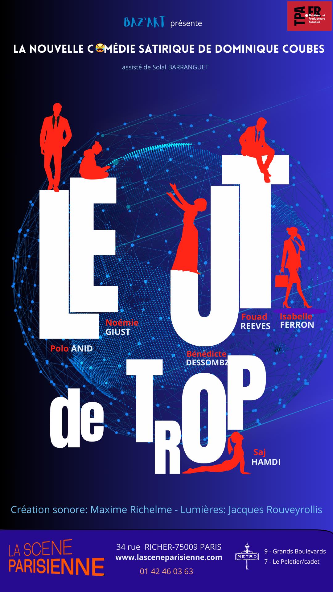 Le JT de trop, la nouvelle pièce de Dominique Coubes croque avec une ironie jubilatoire le monde des élites, des artistes et des médias. Un texte mordant, un rythme effréné, des dialogues ciselés ; voici une satire de notre époque, aussi drôle qu'implacable. Une farce contemporaine qui oscille entre éclats de rire et vertige du désastre.