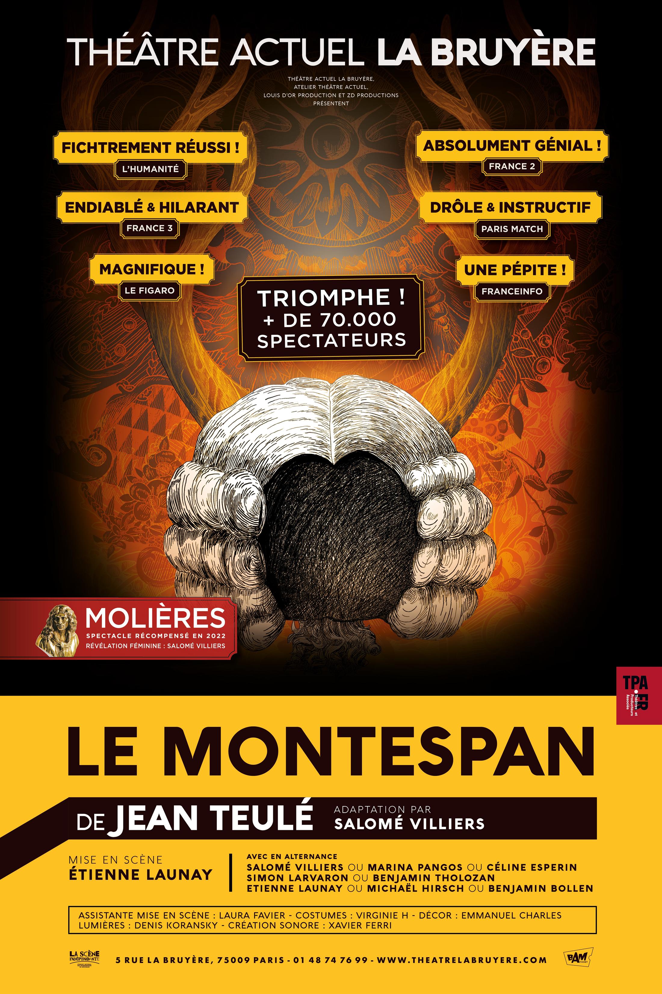 Des comédiens tous 3 incroyables qui réussissent à nous émouvoir avec une histoire vieille de 250 ans bravo ! Pour moi une mention spéciale à Céline Espérin et Étienne Launay que j’ai adoré, très expressifs, émouvants et drôles dans tous leurs rôles à transformations ! Très intéressante l’histoire de la Montespan racontée du côté de son mari, personnage atypique un vrai gascon rebelle !!! Mise en scène inventive, mais fluide très agréable. Les comédiens, les décors, la musique et les costumes nous font voyager avec émotion dans le 17e et sa démesure baroque sans les inconvénients ! Bref j’ai adoré !