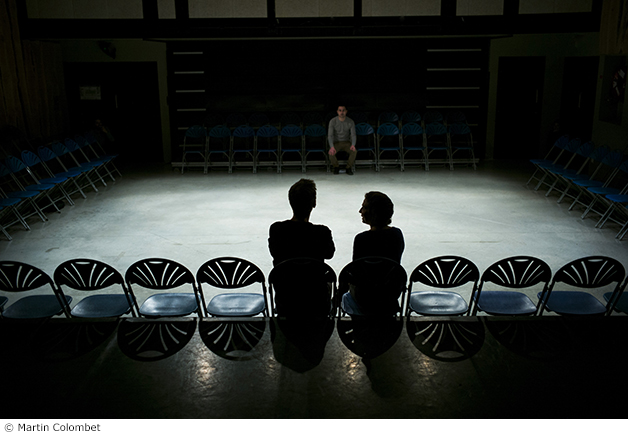 - La pièce s’écrit à partir d’improvisations. Lors des répétitions, les acteurs ont improvisé longuement sur des situations dramatiques, avec pour but non pas de produire une vaste matière à spectacle dans laquelle nous pourrions piocher, mais plutôt d’affiner, d’assécher la parole, de la mettre en relation avec le silence. Pendant les représentations, le canevas est serré, mais les mots peuvent changer, ou ne pas être dits. Les acteurs recréent les uns pour les autres le vide entre les mots, celui qui renvoie au vertige provoqué par la page blanche.