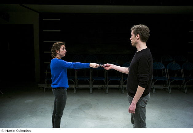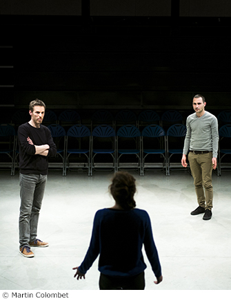 Au début de la répétition, comme au début de la représentation, les acteurs sont autour de l’aire de jeu, aux mêmes places que les spectateurs. Toute commence par la possibilité de ne pas prendre la parole. Tout comme Bême peut ne pas remplir sa copie, lorsqu’il est face à elle.