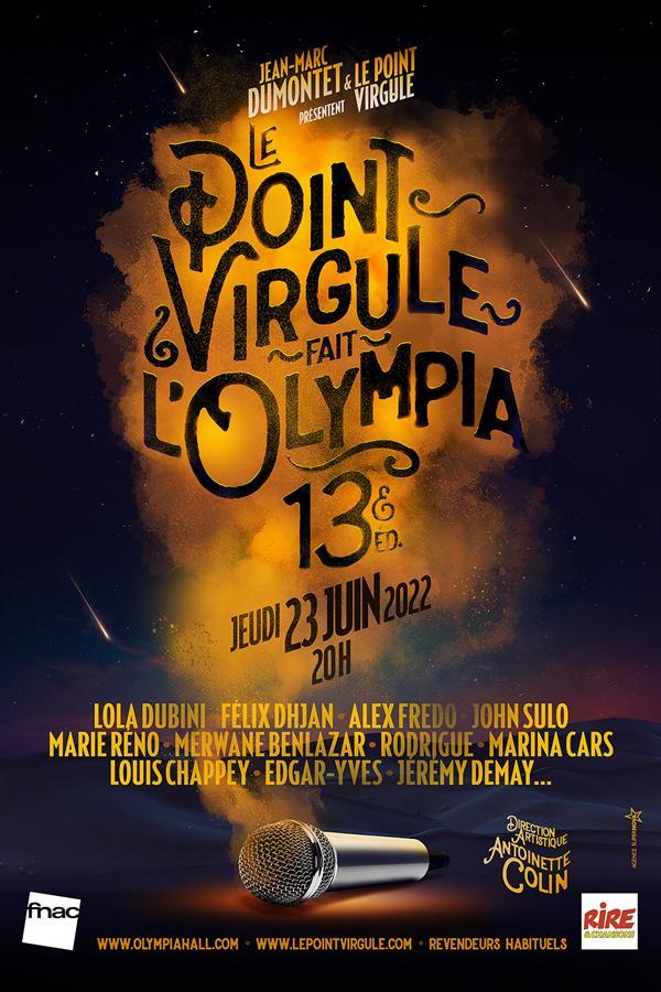 La plus petite des grandes salles parisiennes investit une nouvelle fois la salle mythique de l'Olympia et a réuni pour vous les humoristes les plus drôles de leur génération. Alors laissez-vous surprendre et faîtes-nous confiance, déjà plus de 40 ans que Le Point Virgule révèle les futurs grands de l'humour... Préparez vos zygomatiques, ils seront soumis à rude épreuve lors d'une soirée inoubliable ! Et vous pourrez dire : "J'y étais ! "