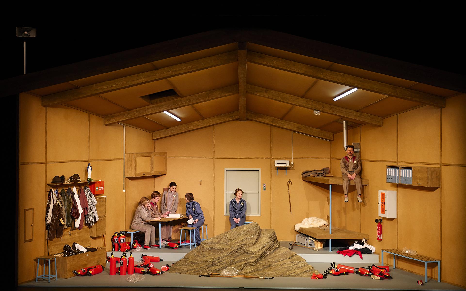 Pour cette production tri-nationale (Lausanne, Milan, Bobigny), les six interprètes se retrouvent donc dans un chalet – ou serait-ce un baraquement, ou un refuge ? – littéralement posé au sommet d’une montagne. Nul ne sait s’ils sont réfugiés, cachés, préparant à l’écart un événement d’importance, ou s’ils s’isolent simplement d’un monde en désordre. Ils parlent différentes langues – français, italien, allemand et anglais (d’Écosse) – et il n’est pas du tout certain qu’ils se comprennent.