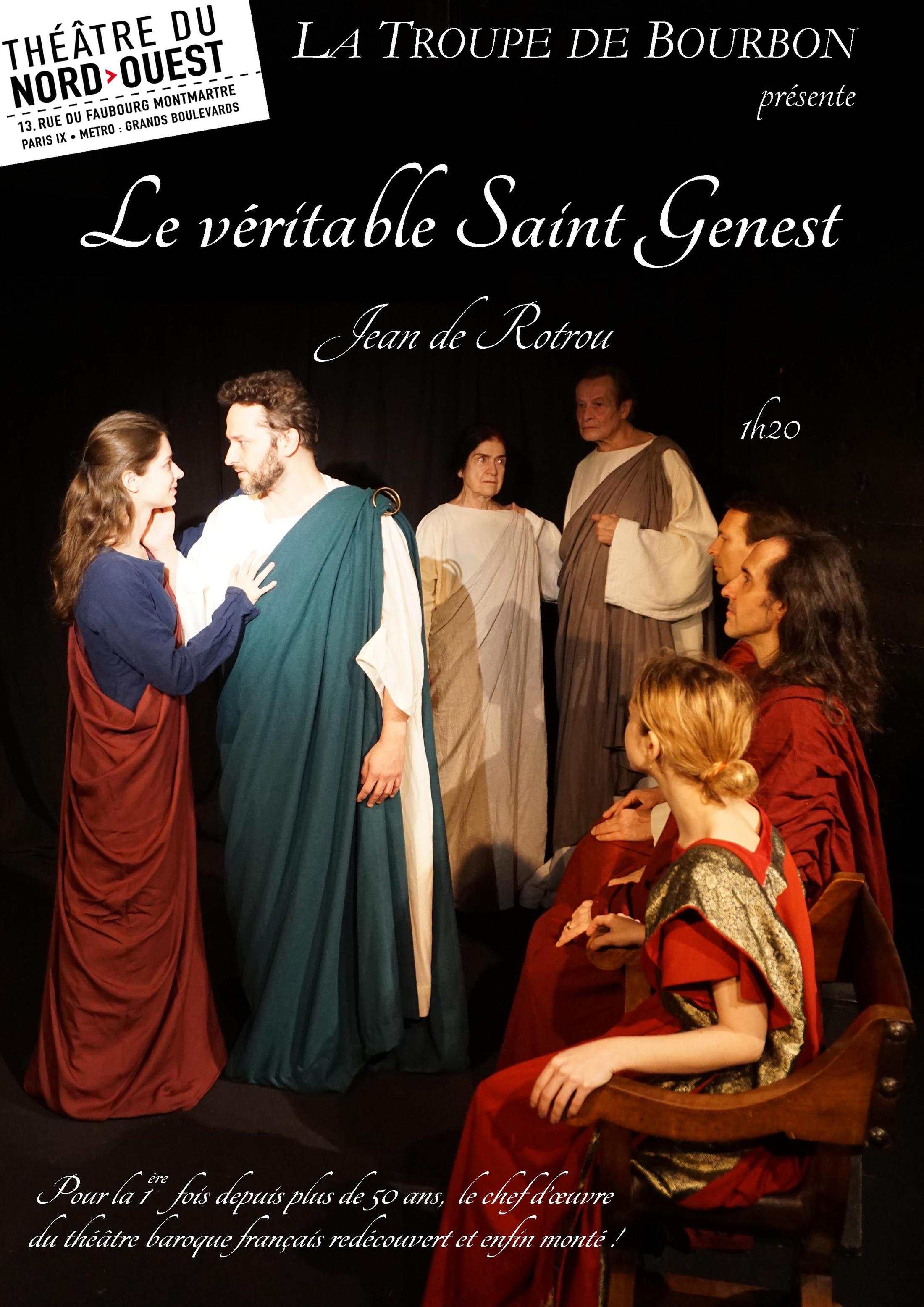 Quand Rotrou (1609-1650) consacre une pièce au saint patron des comédiens, Genest, il ose ce que personne n’avait jamais osé : faire primer le mérite sur la naissance. Et faire de Genest un saint non pas bien que comédien, mais parce que comédien. Et pour bien nous persuader que le monde n’est qu’un gigantesque théâtre, il nous présente des comédiens qui répètent, prennent une voix venue du ciel pour une blague du souffleur et… des empereurs qui comme eux ne font que jouer un rôle.