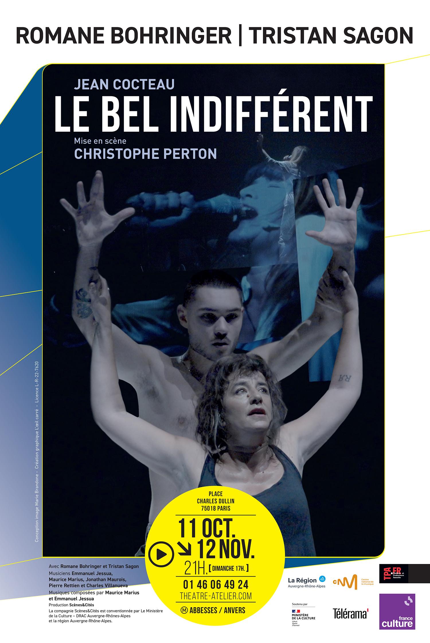 Le Bel indifférent s’inscrit dans un projet d’une trilogie autour de trois portraits de femmes dessinés par Cocteau, où l’Amour et la Mort se mélangent et se fondent comme une drogue puissante et vénéneuse. Ce thème déjà central dans la relation mère/fils dans les Parents terribles se déploie à nouveau ici dans le récit d’un amour toxique entre une chanteuse célèbre et son jeune amant. Cocteau aime les femmes, il les comprend, il s’empare de leurs corps et fait vibrer les âmes meurtries par la sensualité de sa poésie. Sur la scène plane le fantôme d’Edith Piaf, éternelle amoureuse désespérée, cherchant le contrepoint d’une vie faite d’excès et de paroxysme, dans le graal amoureux susceptible d’offrir l’oasis de paix. Mais derrière la beauté angélique des visages aimés se dissimule l’enfer. Les puissances tragiques et universelles de l’amour et de la mort surgissent alors pour s’affronter et la poésie de Cocteau se mêle ici aux accents d’une musique pop, nous embarquant dans l’émotion d’une chanteuse, d’une actrice, d’une femme qui jette toutes ses forces dans la bataille et tente de repousser la solitude pour hurler son amour, sa joie et son désir de vivre libre.