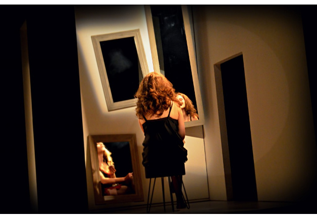 Ce pourrait être la loge des artistes, le trou du souffleur, la petite cuisine d’une maison. Un espace délimité par des murs blancs où l’on se sent trop à l’étroit. On ne peut pas trop bouger, pas faire de grands mouvements. On est coincé.
