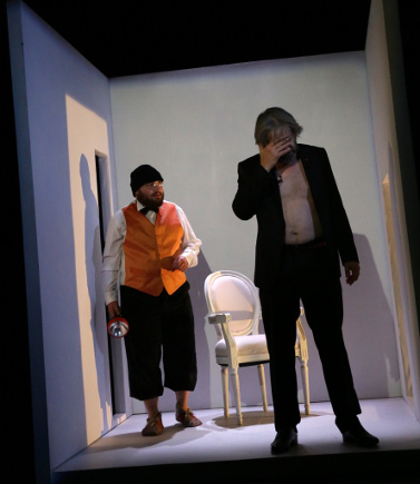 Deux petites portes de chaque côté de la boîte permettent de sortir mais elles sont soit trop étroites, soit trop basses. On ne peut pas y passer normalement. Et autour le vide, le néant. On y circule d’ailleurs très peu. On est surtout enfermé dans cette boîte jusqu’au moment où le vieil acteur a besoin des mots de Shakespeare, de Pouchkine pour partir, pour mourir. Il a besoin de plus d’espace… et le théâtre s’ouvre, s’agrandit. Le rêve, le théâtre, la mort nous emmène au-delà.