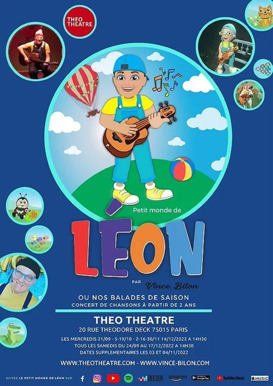 Venez découvrir et retrouver l’univers de la chanson enfantine, en compagnie du chanteur et guitariste Vince Bilon dans le rôle de Léon. Au fil de sa promenade mise en scène drôle et poétique, Léon y croisera nombreux personnages qui ont marqués notre enfance ; c'est ainsi que vous pourrez chanter à tue-tête et participer activement à toutes les interactions. L'Artiste Vince Bilon crée son répertoire en fonction de ce qui passionnent les enfants (fêtes, évènements, thèmes de saison...). Toutes les comptines de son spectacle sont présentées sous la forme d’un concert solo, en live 100 % acoustique Voix/Guitare. Unique en son genre, ce concert jeune public est un véritable « One-man-show » qui se joue avec succès depuis huit saisons un peu partout en France.