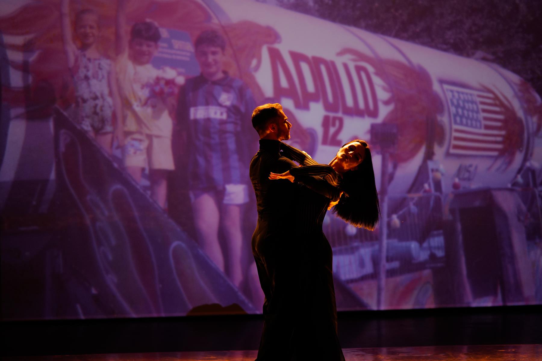 Sur un lino de danse doré, accompagné de projections d’archives et d’un couple de danseurs qui vient ponctuer sa parole de démonstrations de haut niveau, l’ancien prodige confie ses souvenirs d’adolescent, la découverte de la sexualité, la peur de l’échec, le deuil du père et l’effort pour gagner l’amour des parents. Alternant danse et récit, les interprètes invitent même le public à une chorégraphie participative, de la valse au cha-cha-cha, comme autant de chapitres d’une jeunesse qui s’élance sur le chemin de la libération.