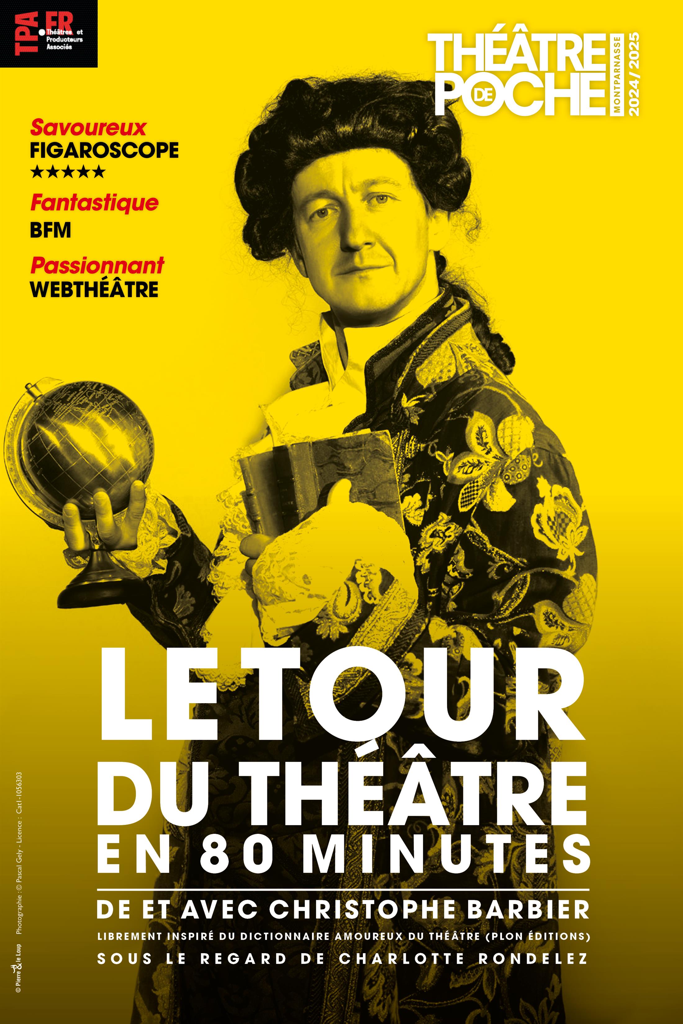 « Le monde du théâtre ne s'est pas fait en un jour. Christophe Barbier, journaliste et passionné d'un art vieux de 2500 ans, nous le démontre avec passion. Dépourvu de son indémodable écharpe rouge, le comédien égraine avec humour et engagement une myriade d'anecdotes à partir de son Dictionnaire amoureux du théâtre. De Molière aux stars du boulevard, des amphithéâtres romains aux théâtres parisiens, du politique au divertissement, ce Tour du théâtre embrasse large. Et apporte son lot de réponses à des questions aussi terre à terre que passionnantes : pourquoi dit-on « merde » aux comédiens avant qu'ils entrent en scène ? Comment est né l'art de la mise en scène ? Une exploration qui s'adresse à tous, instructive et captivante ! » Télérama, TTT