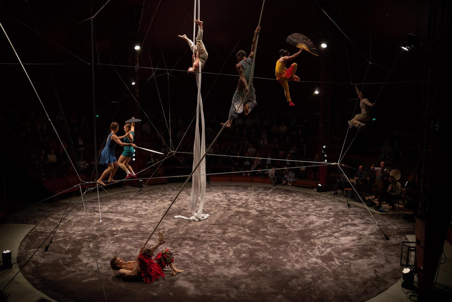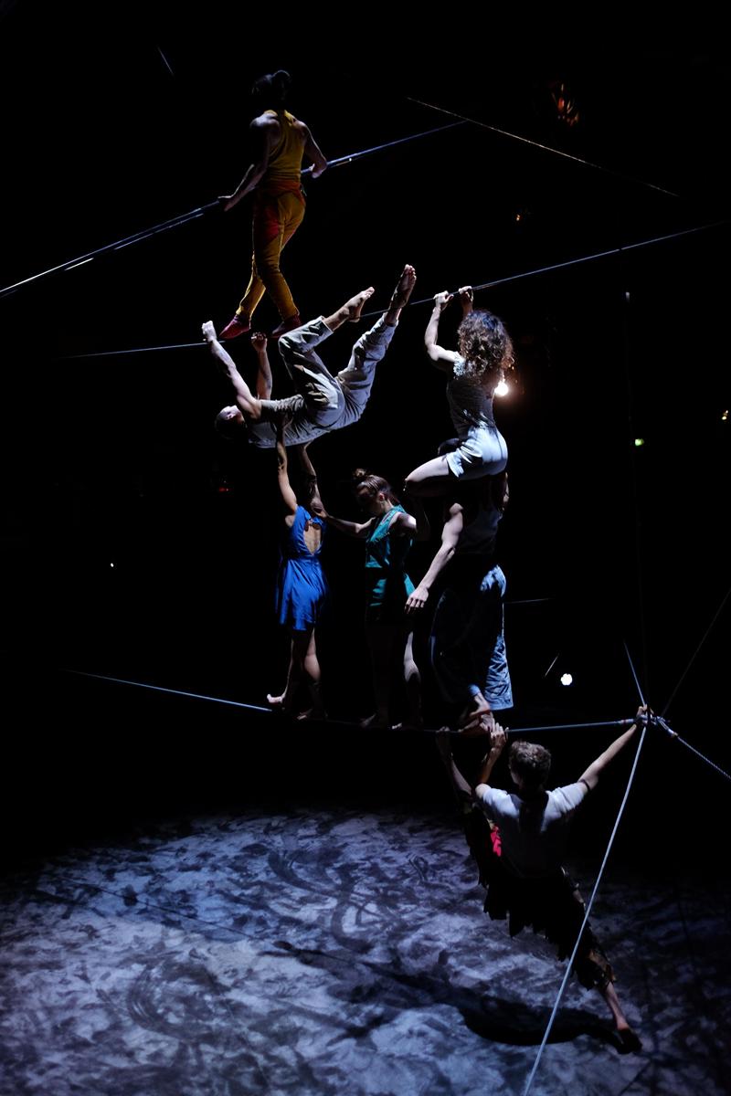 Sous le chapiteau des Colporteurs, tout évoque la nature : le sol a la couleur de la terre, une forêt de fils, de cordes et de mâts a poussé… En meute, solitaire ou en couple, sept acrobates et trois musiciennes et musiciens explorent ce territoire. Guidés par leurs instincts, elles et ils rivalisent de souplesse et d’agilité pour se suspendre, s’envoler, ramper ou virevolter. À partir de 8 ans