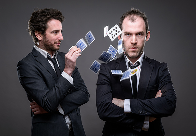 Matthieu Villatelle et Rémy Berthier sont deux magiciens qui jouent avec nos certitudes. Ils détournent notre attention, nous manipulent, nous questionnent, nous font douter, et en même temps souvent nous font sourire.
