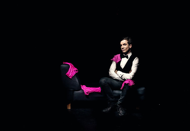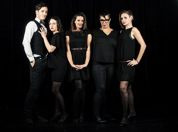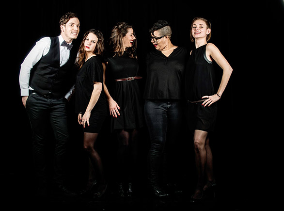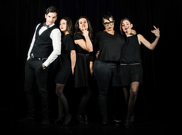 4 improvisatrices sur talons, robes noires, rouge aux lèvres et au bout des ongles, orchestrée par un maître de cérémonie.