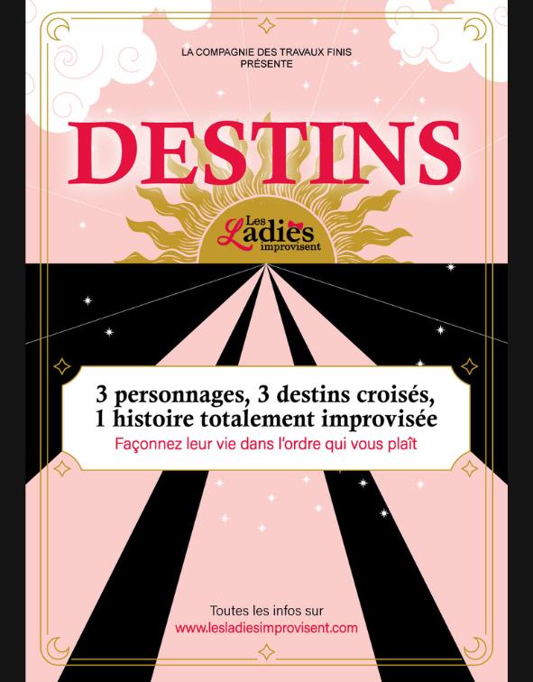 Les voies de la destinée sont-elles toutes tracées ? Et si vous étiez en charge de lire et de décider des lignes de vie de trois personnages ? Un signe du zodiaque, une carte de tarot, un animal totem ou un objet : c'est vous qui choisissez l'élément autour duquel leurs destins vont se lier et elles improvisent le reste ! Même si rien ne se passe dans l'ordre chronologique et que les Ladies ne sont jamais là où on les attend : elles écrivent en temps réel, les grands moments de leurs vies dans les lieux et aux périodes que vous leur suggérez.