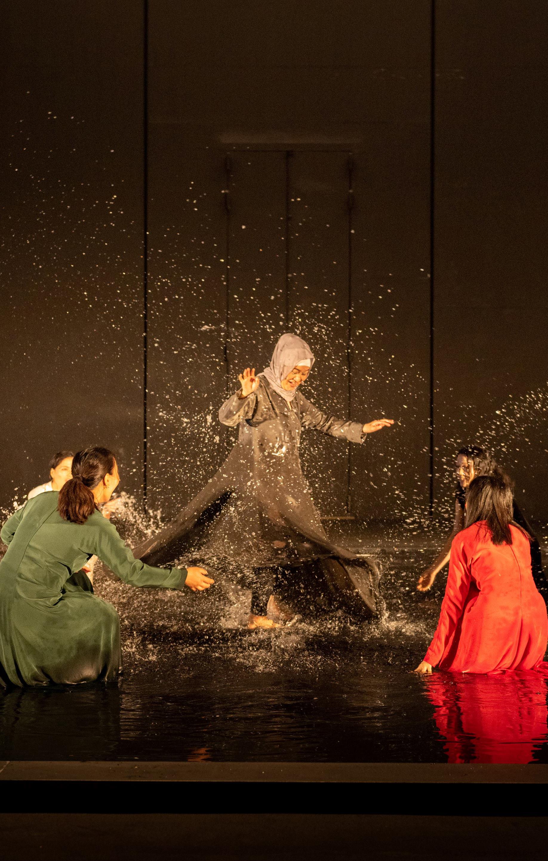 Entre la joie énergique du jeu et l’acte politique transgressif, elles déploient le récit d’Antigone, la jeune femme qui dit non, passant avec aisance de l’incarnation la plus totale à l’évocation la plus subtile. Sous leurs pieds, un plateau recouvert d’eau ; au-dessus d’elles, une Lune immense, comme un œil spectaculaire suspendu. C’est en engageant un dialogue avec le Ciel que chacune apparaît, telle qu’en elle-même. Les Messagères sont ces citoyennes afghanes qui veulent dire en Occident leur amour pour leur pays et en être les ambassadrices fortes et résilientes. Les Messagères sont ces jeunes femmes du XXIe siècle qui résistent, se construisent et inventent leur destin, malgré tout.