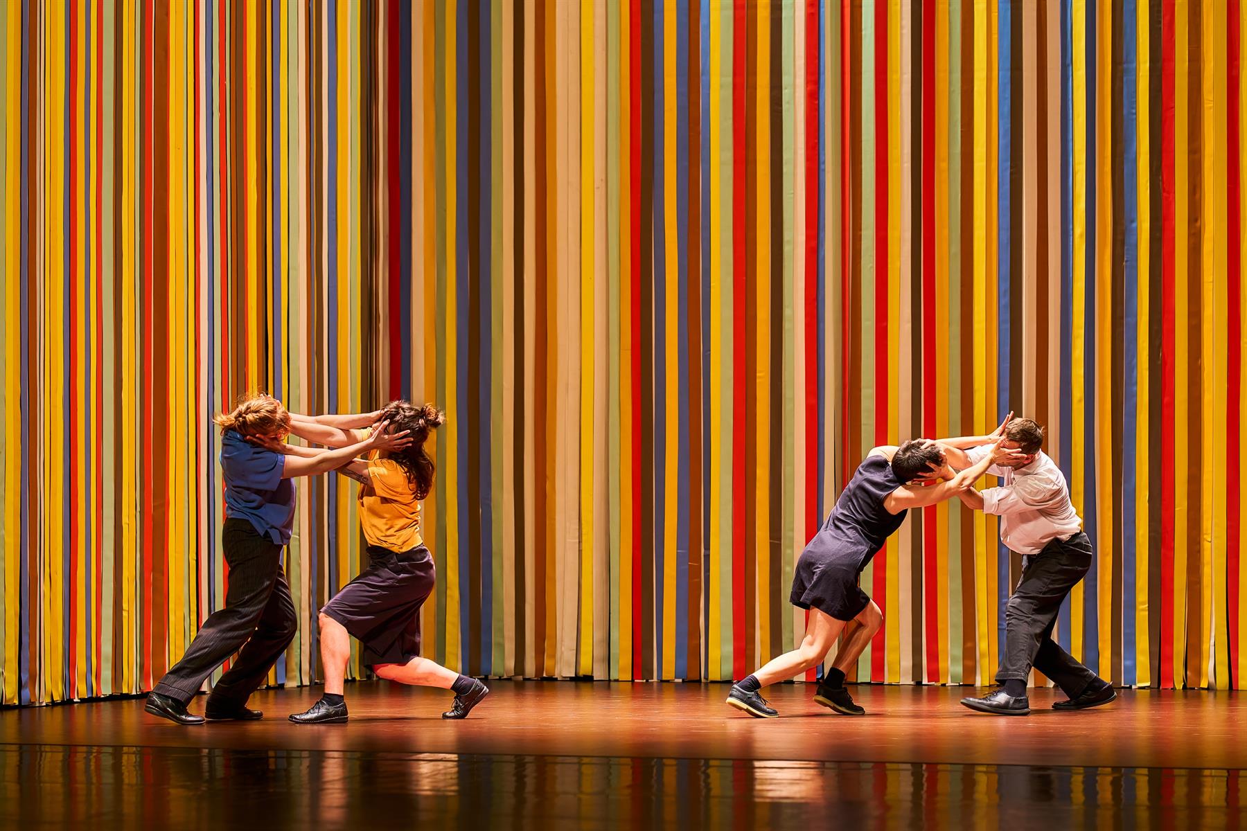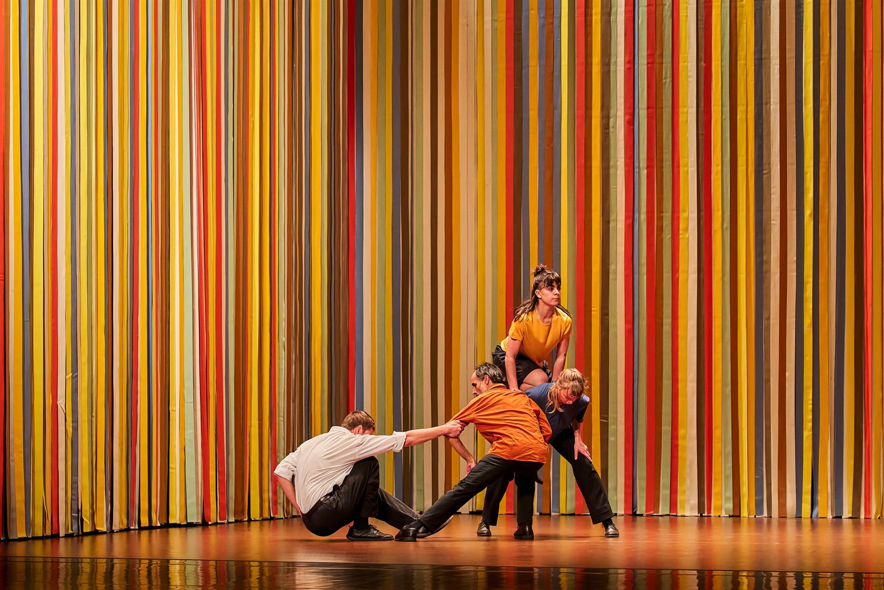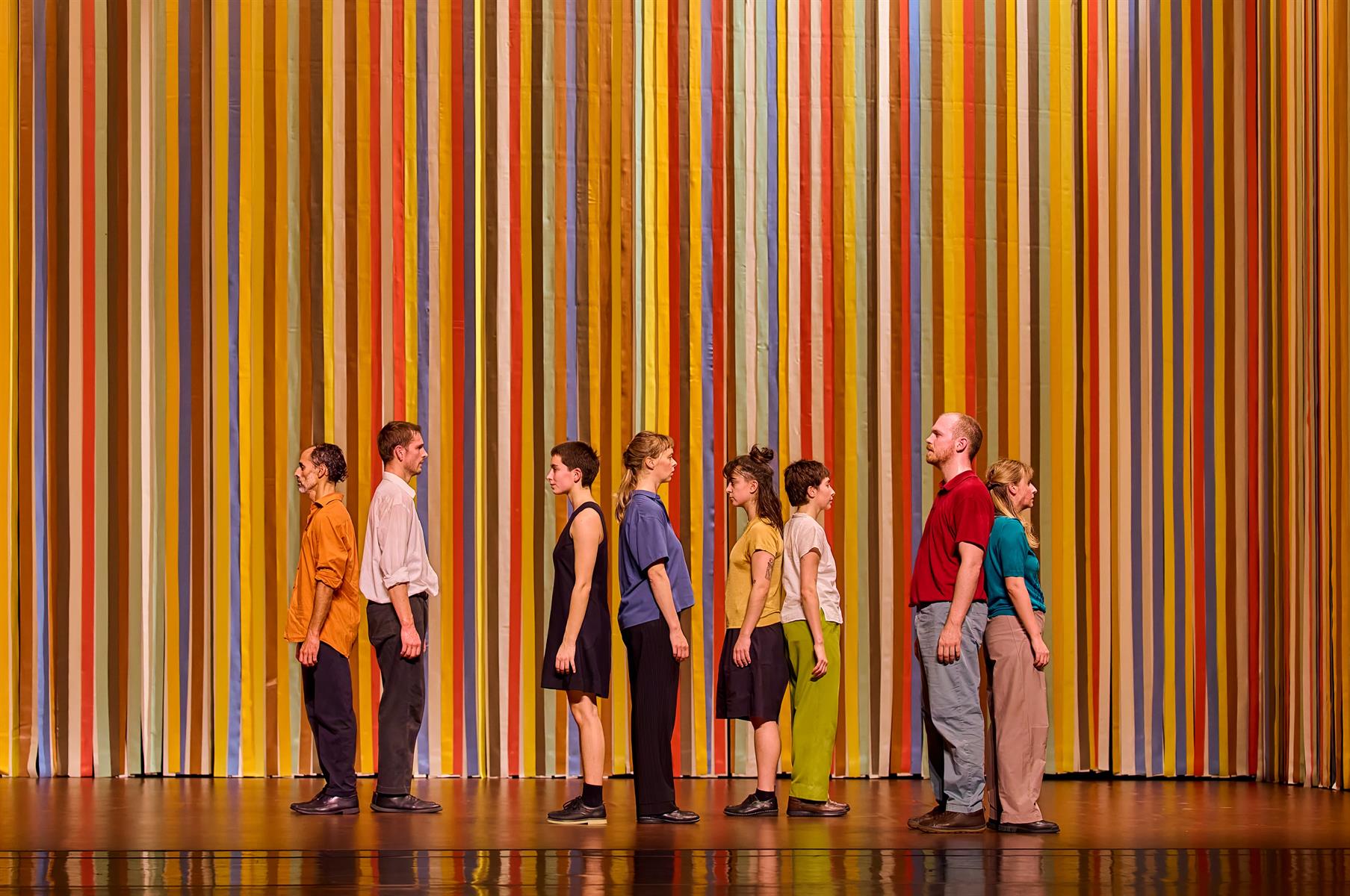 Créée en 2002 pour la Biennale de la danse de Lyon, Maguy Marin pensait alors aux pays d’Amérique du Sud, tout juste sortis de dictatures sanglantes mais laissant peu d’espoir aux plus démunis. Aujourd’hui, la pièce, sous tension, ressemble presque à un constat de notre société où « la réussite de quelques-uns fait face à l’impuissance de plusieurs milliards d’autres », et l’actualité des crimes, des guerres, des jeux de pouvoir iniques, et des répressions sont plus que jamais notre affaire. La pièce est implacable. Apparitions, disparitions, arrêt, chutes, et corps que l’on tire derrière un joli rideau de plastique aux couleurs chaudes. La violence est partout, l’oxygène nulle part. Ce huis clos à huit personnages qui se regardent et se jaugent, s’évitent ou se toisent, se croisent ou se bousculent, suffit à dire la révolte ou la soumission inscrites dans les corps. Victime ou bourreau, on ne sait plus. Le rapport de force est palpable à chaque minute, la résistance indispensable. Et « malgré les bons points distribués aux bons élèves par la finance internationale épuisant les luttes et ruinant les populations, les applaudissements ne se mangent pas ».