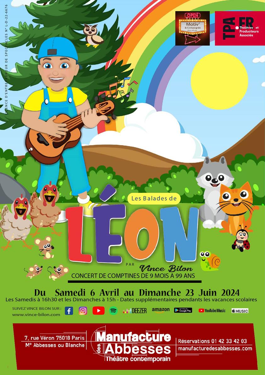 On découvre, on retrouve et on se laisse emporter par les personnages et les refrains de notre enfance ainsi que par les créations originales de l'Artiste Chanteur et Guitariste Vince Bilon qui interprète sur scène avec humour, poésie et tendresse le rôle de Léon.Ce one-man-show musical pour tout-petits est une véritable passerelle entre plusieurs générations ; c'est un bon moment à partager en famille, à savourer sans modération !