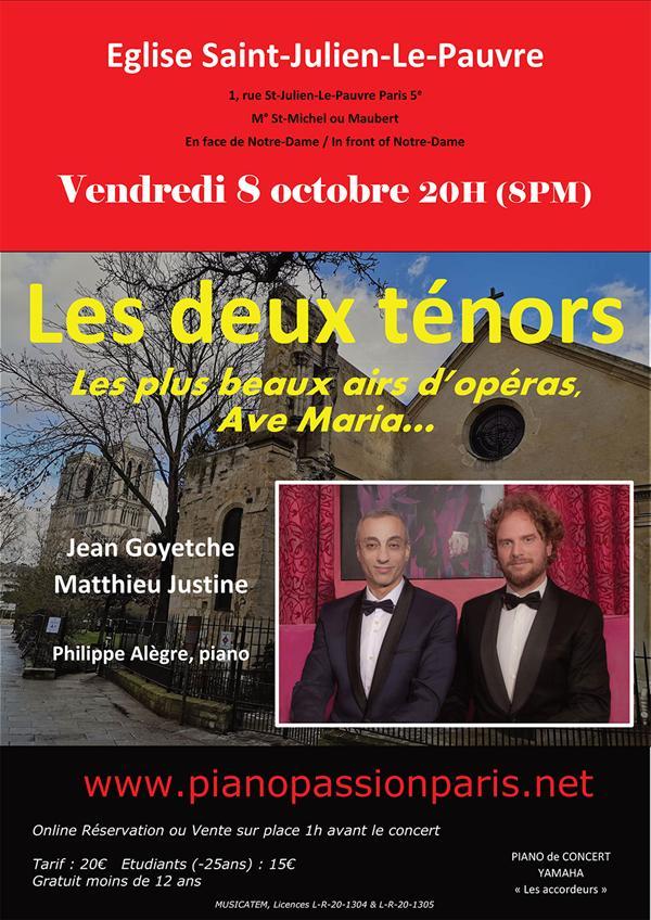 Matthieu Justine et Jean Goyetche, deux pointures de l’art lyrique ont tous deux ce point commun de l’éclectisme. Chanter l’opéra, l’oratorio, l’opérette, la comédie musicale ou la chanson reste le même plaisir, ce qui est chose rare dans ce milieu dit « classique ». Invités au Théâtre des Champs Elysées, à la Philharmonie de Paris, dans les grands festivals tel que Aix En Provence, ces deux magnifiques artistes proposent un voyage à travers les styles, accompagnés au piano par Philippe Alègre.