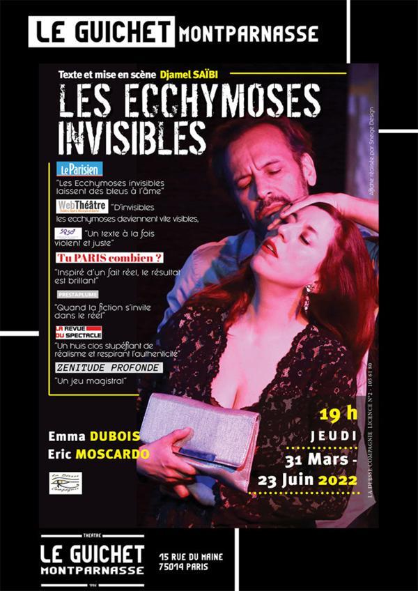 Après l'excellent " Exit " et ses 5 nominations aux Petits Molière, j'attendais avec impatience de découvrir " Ecchymoses invisibles ", la nouvelle pièce de la Déesse Compagnie, qui se joue au Théo Théâtre sur un thème tristement d'actualité, avec un triste décompte à ce jour de 121 femmes décédées suite à des violences conjugales. Cette pièce nous prend aux tripes dès le départ. Au "trip" devrais-je ajouter, dans son sens anglais de voyage, mais un voyage vers l'enfer, un de ces voyages dont même le spectateur ne revient pas indemne, obligé malgré lui d'être un témoin voyeur de cette violence verbale qui monte crescendo alors que Corinne, remarquablement interprétée par Emma DUBOIS, se libère progressivement mais dans la douleur, comme une chenille qui devient papillon et parvient à s'envoler de l'emprise qu'exerce sur elle son époux, incarné par Eric MOSCARDO et dont le personnage est le portrait parfait du pervers narcissique et manipulateur avec ce double visage, séduisant à l'extérieur et faisant vivre un enfer à celles et ceux qui sont proches. Le trait de génie de l'auteur et metteur en scène Djamel SAIBI est d'arriver à ne pas le faire complètement détester, à nous faire percevoir la faille qu'il a en lui, à la souffrance dont sa femme, veut le délivrer et à maintenir la tension de la pièce jusqu'à la fin. Je suis sorti sonné d'Ecchymoses invisibles. C'est une pièce remarquable, parfaitement incarnée avec une mise en scène léchée, une musique et une lumière qui accompagnent la tension croissante de la pièce.