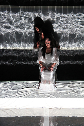 C’est une femme divisée dans son espace mental, dans le temps aussi, puisque les minutes filent comme des figures fragmentées. Voyage immobile, le monde réel bascule. Elle se raconte, dit pourquoi elle a tué ce mari honnis, parce qu’il a sacrifié sa fille mais aussi parce qu’il prétend au retour de la guerre de Troie, reprendre ce pouvoir qu’elle ne veut pas rendre.