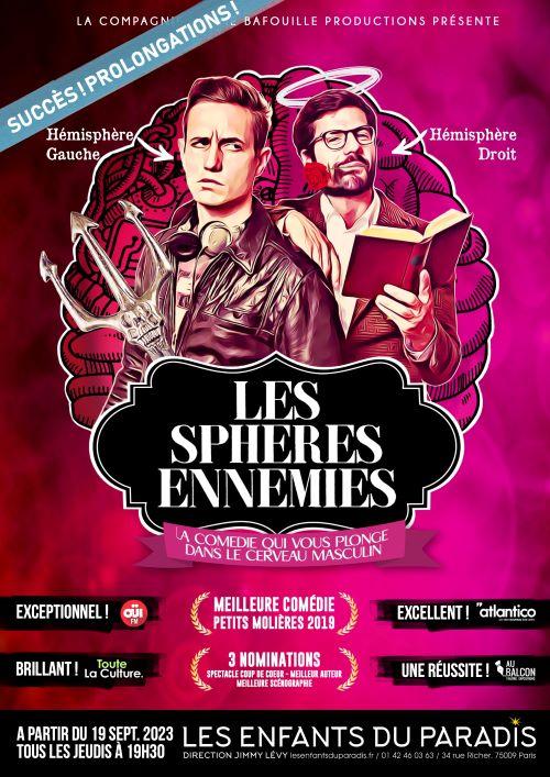 Du coup de foudre aux vieux jours, du premier rendez-vous à la demande en mariage, les Sphères Ennemies raconte une grande histoire d’amour... mais depuis l’intérieur de la boite crânienne d'un jeune homme, où s’affrontent le petit ange et le petit diable qu’on a tous dans la tête.