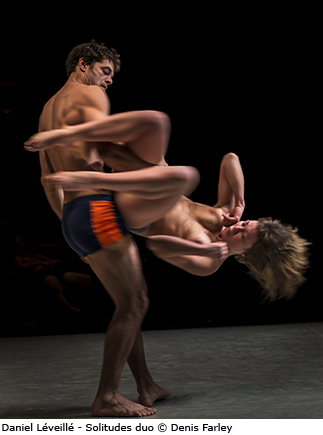Daniel Léveillé présente trois des six duos qui composent Solitudes duo, pièce créée en 2015 à la suite de Solitudes solo qui initiait un nouveau cycle de création pour le chorégraphe québécois connu pour son usage de la nudité, son goût pour le minimalisme et la répétition.