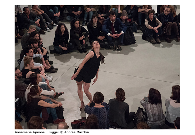 Un corps de femme au centre du plateau et des spectateurs, debout, habillé de noir, tête baissée. Les bras se dressent à l’horizontal, le visage se relève, le regard est droit et immobile. Au son, des pulsations qui affluent et refluent. Soudain on entend comme une machine, ponctuée des bruits que produit l’effort. Annamaria Ajmone s’élance alors. Sa danse est fluide, rapide ; son corps se déhanche, les articulations se cassent.