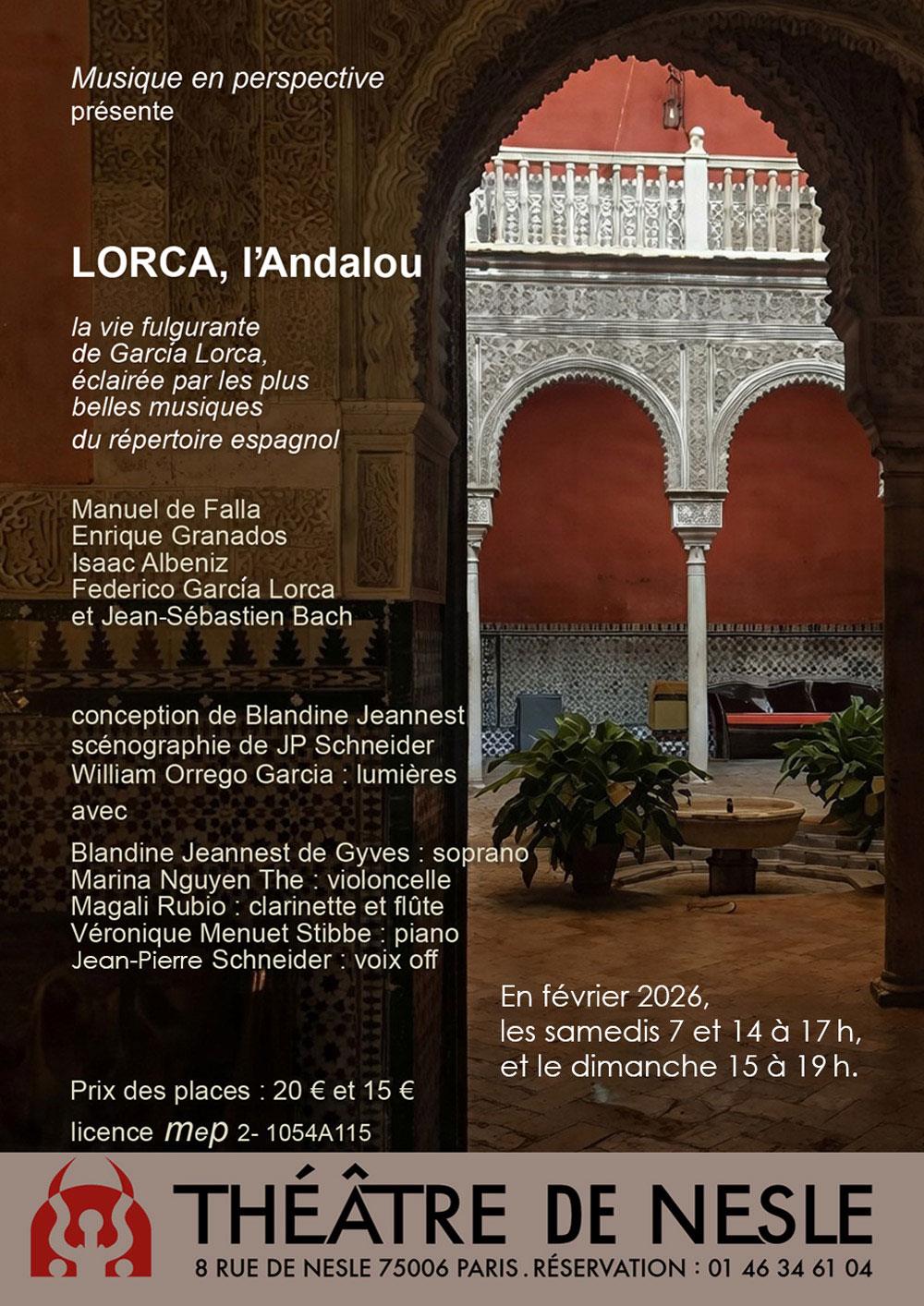 Blandine Jeannest, poursuivant son travail de mise en relation de la poésie et de la musique avec les musiciens de Musique en perspective et Jean-Pierre Schneider, peintre et scénographe, a souhaité mieux comprendre, après un voyage en Andalousie, l’âme de cette terre de passion. La poésie de García Lorca, à la fois douce et violente, traduit et fait saisir une terre de contrastes : civilisation et sauvagerie, Orient et Occident, religion et athéisme.