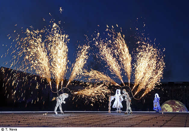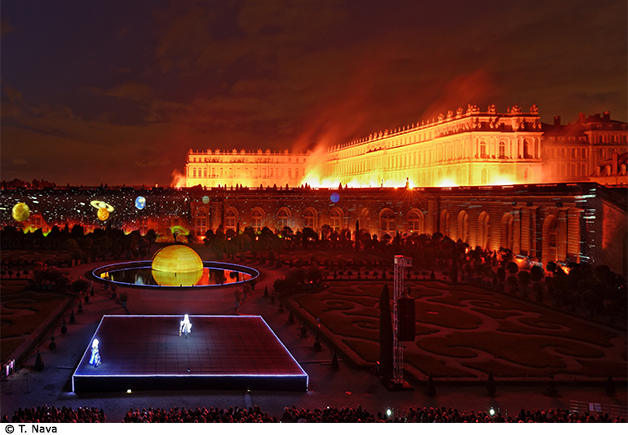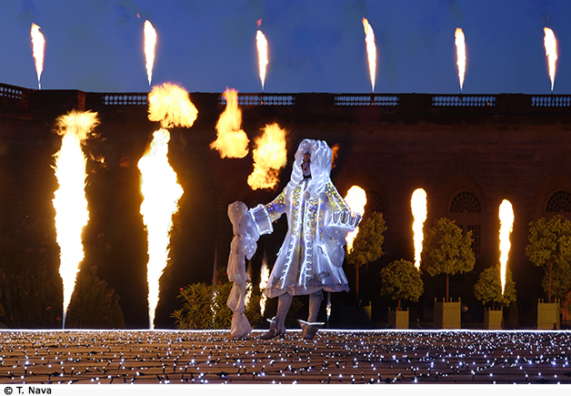 Louis XIV, Le Roi de Feu, mêlera pour cette soirée d'hommage à Versailles les moyens croisés des flammes, des feux d'artifice, de la vidéo et des personnages lumineux et porteurs de feu : Groupe F fête le Roi Soleil à la hauteur de sa gloire !