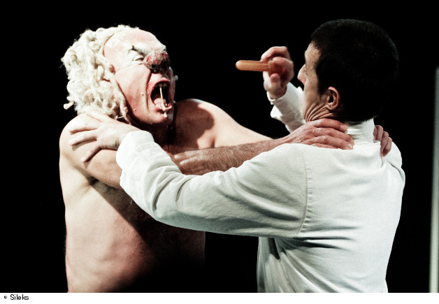 Notre tentative de réveiller le duo classique du clown blanc et de l’auguste, où historiquement l’auguste a détrôné le clown blanc en lui volant son nom et la vedette et en faisant de lui un faire valoir, une « spalla » (une épaule de jeu) nous a invité à repenser la figure du blanc d’un point de vue de l’ordre symbolique entre la dictature diffuse du « on » et les incarnations de la hiérarchie. Alors, le clown blanc est devenu pour cette création une présence absente, un oxymore du pouvoir.