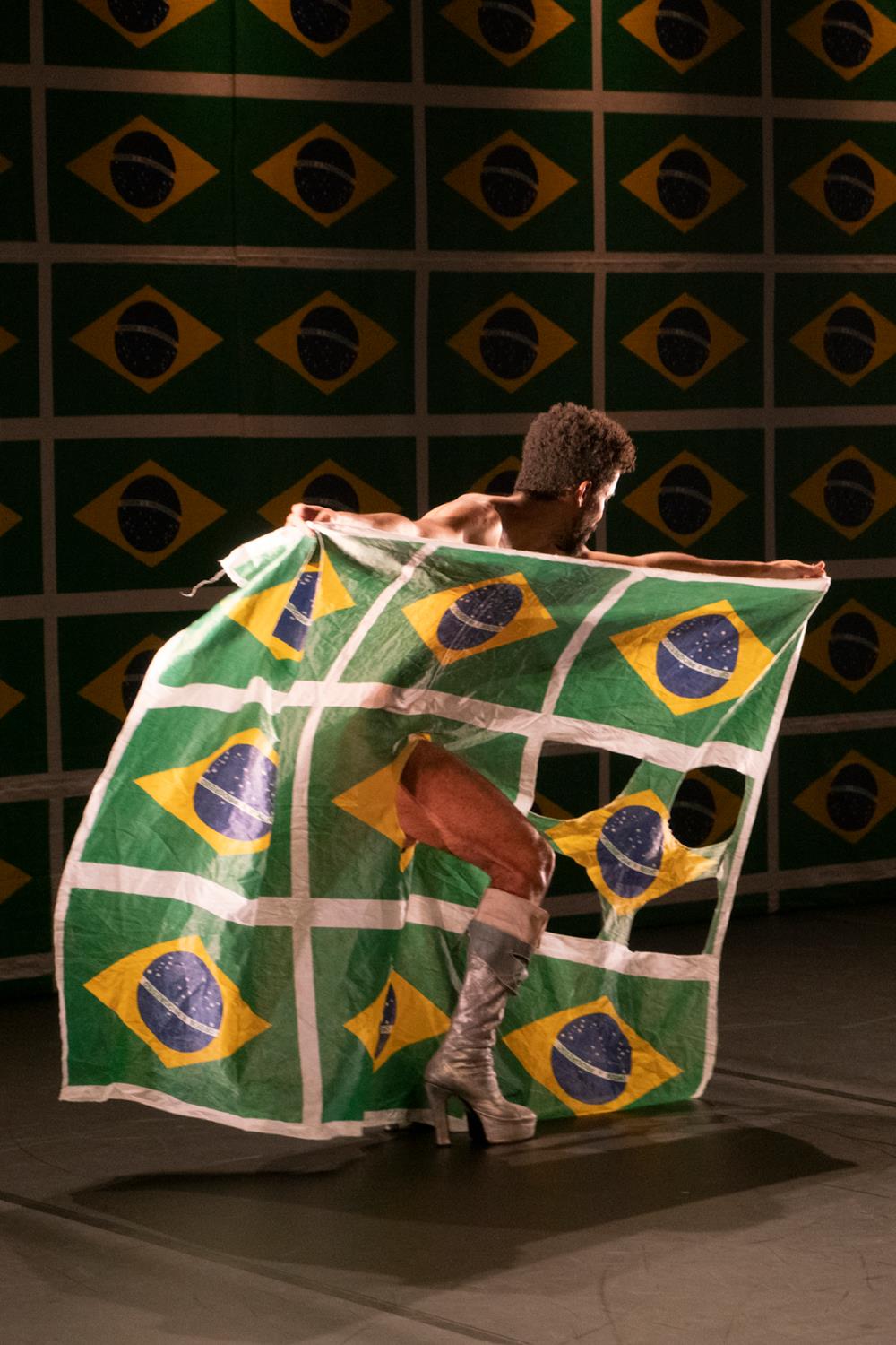Pris en tenaille entre exotisme et érotisme, le corps noir, objet de tous les fantasmes, retourne les stéréotypes et emblèmes du Brésil par la danse de l’histoire coloniale de son pays. De la samba à la feijoada, en passant par l’appropriation du drapeau national, il fait de la grâce la plus efficace des subversions.