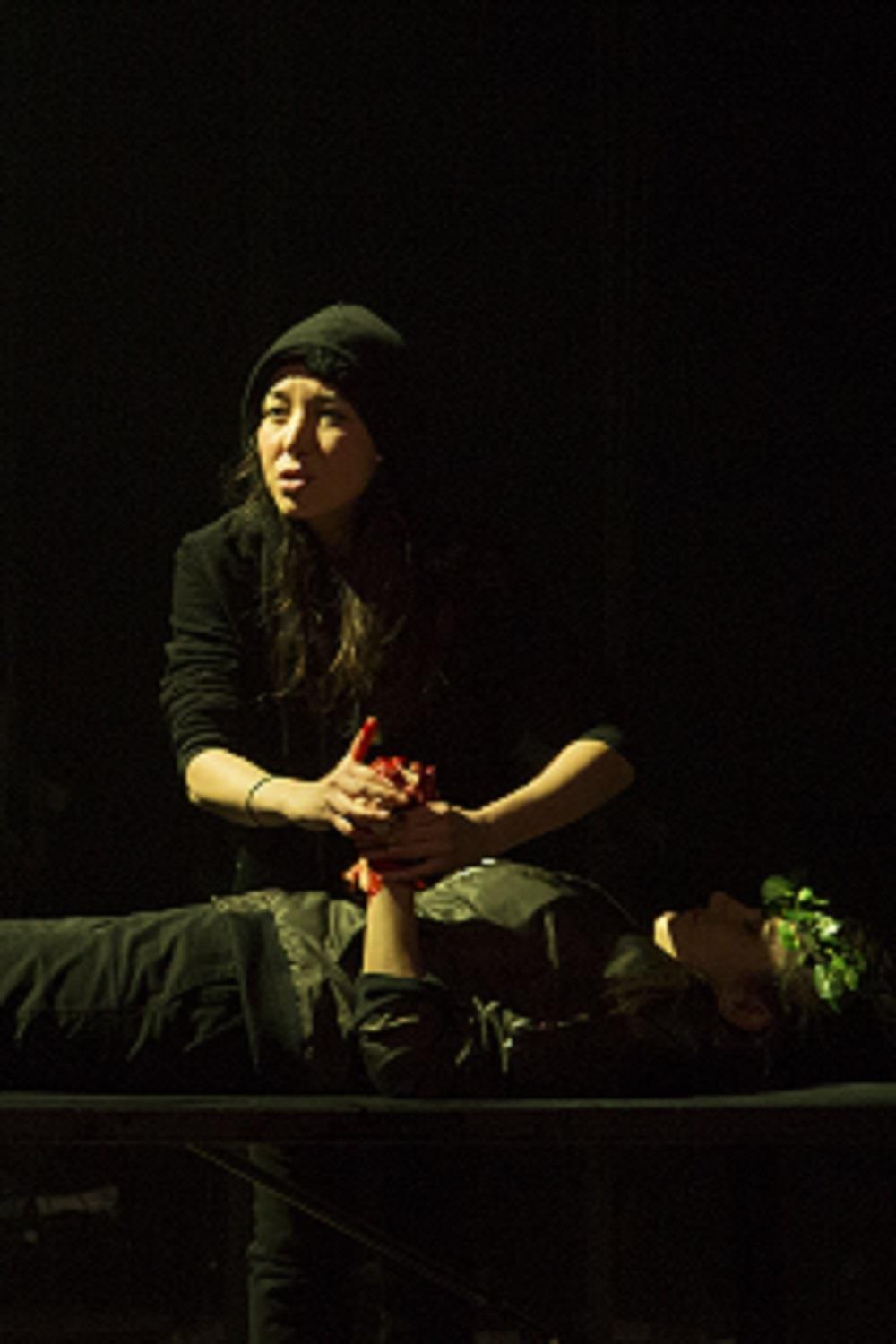 L’ensemble Estrarre interroge cet univers patriarcal et vieillissant en choisissant une distribution féminine et cosmopolite. Un chœur polyglotte de cinq comédiennes accompagne la tragédie shakespearienne en musique.