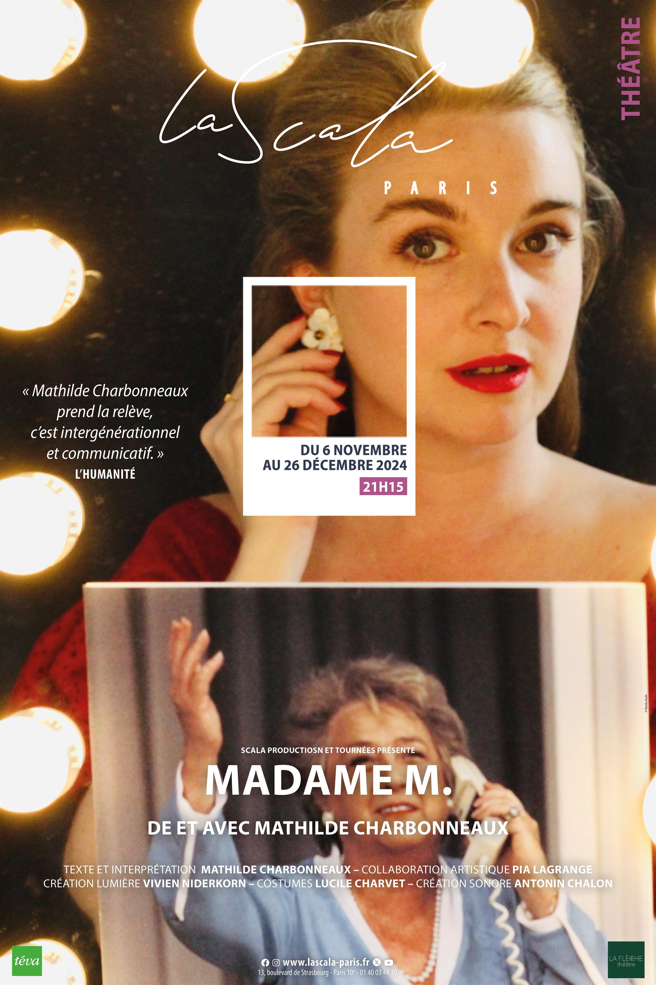 Madame M. c'est l'histoire d'une petite dame qui à la vie était toute simple et qui, une fois sur scène, devenait une grande dame, un véritable taureau lâché dans l'arène, déchainant les rires des spectateurs. C'est aussi l'occasion de célébrer le boulevard avec son rythme endiablé, ses ruptures, son énergie débordante pour qu'à la fin le délire comique dépasse le sujet même de la pièce.