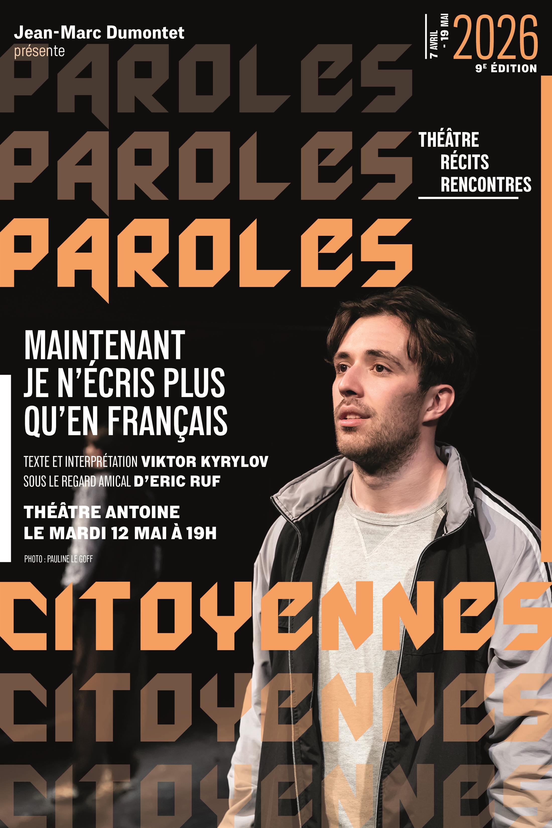 Maintenant je n’écris plus qu’en français est une histoire ukrainienne. Elle nous plonge dans un conflit qui traverse des siècles de destins mêlés entre deux peuples et met en lumière le rapport qu’ils entretiennent aujourd’hui. Le récit intime et les circonstances politiques et historiques s’entrechoquent : la famille et la patrie, la jeunesse et la mort, la haine et l’amour, la trahison et la culpabilité… Le spectacle pose une question essentielle : pourquoi combat-on ?