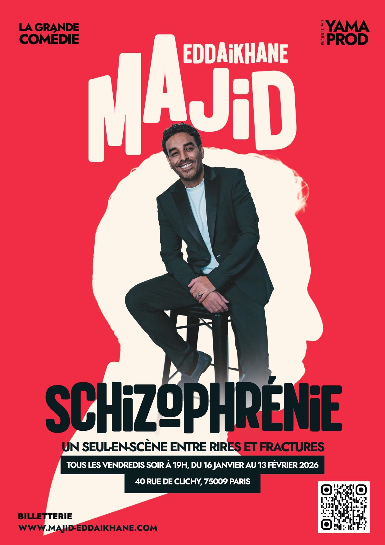 Son travail croise introspection, enjeux sociaux et volonté de faire ensemble plutôt que seulement vivre ensemble. Seul en scène engagé, « Schizophrénie » raconte l’histoire authentique d’un homme, Majid Eddaikhane, qui nous ouvre la porte de son monde intérieur et nous questionne à travers le rire. Cette création sensible et fédératrice parle d’ascension, de santé mentale, de transmission, d’inégalités invisibles, d’identité fracturée, de réconciliation et d’espoir. Face à un climat national où les discours se durcissent, ce spectacle ouvre le dialogue, fait tomber les masques et nous renvoie à nos propres contradictions. Chaque représentation sera clôturée d’une séquence interactive pour favoriser l’échange avec le public en présence d’invités exceptionnels.