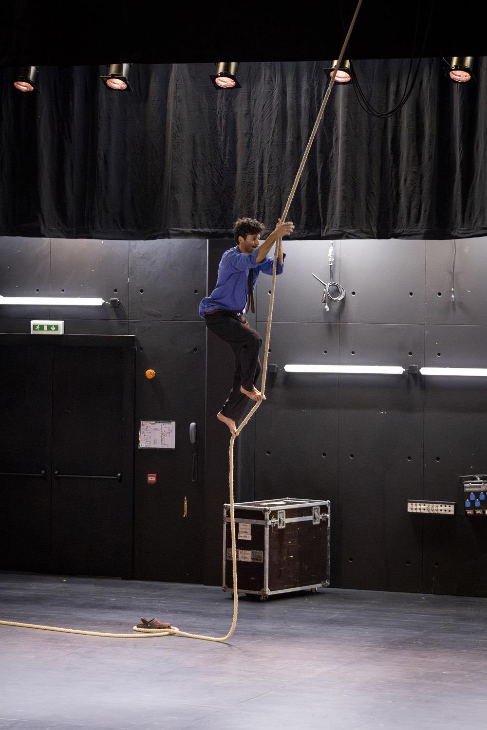 Un homme tente de sortir du Théâtre par tous les moyens, mais le plateau dénudé est devenu incontrôlable.