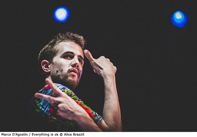 Cela commence par une déclamation ininterrompue mêlant les idiomes et les intonations ; cela se poursuit par un corps enchaînant habilement les figures. Seul en scène, Marco D’Agostin bombarde le spectateur de sons puis d’images et joue du flux permanent, sans dramaturgie spécifique, sans début ni fin, débusquant une hypothétique quête de sens ou de direction mais regardant toujours le public, comme cherchant son assentiment.