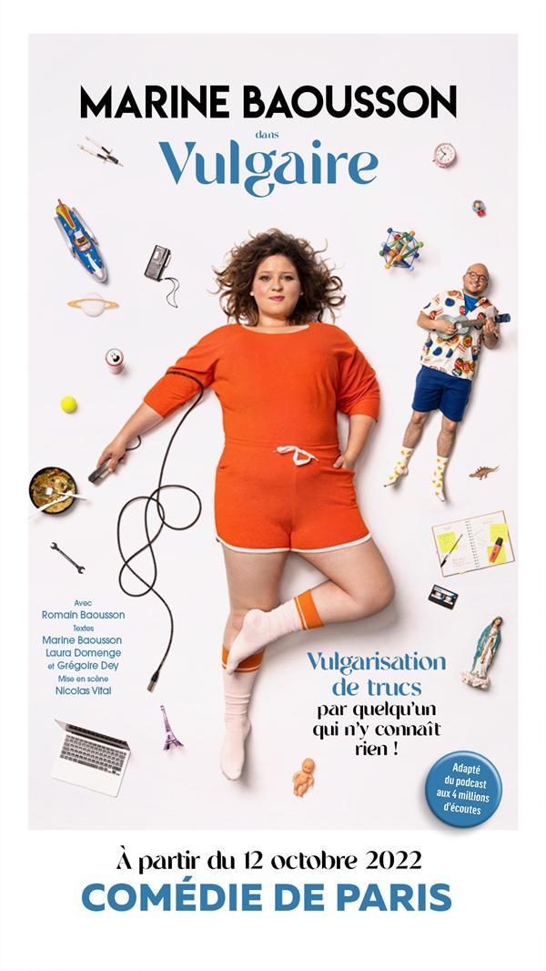 Un spectacle de vulgarisation de trucs par quelqu’un qui n’y connaît rien. Adapté du Podcast aux plus de 3 millions d’écoutes, découvrez enfin Vulgaire - spectacle interactif de Marine Baousson dans lequel vous choisissez les sujets à expliquer. Drôle et ludique !