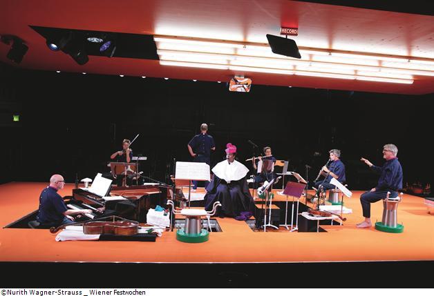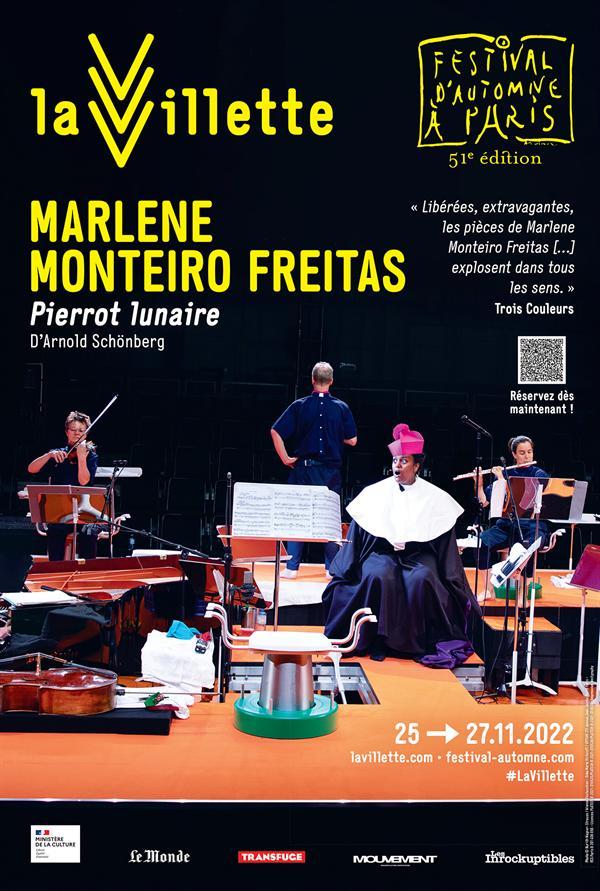 Œuvre majeure du répertoire contemporain, Pierrot lunaire d’Arnold Schönberg annonce le début de la musique atonale au début du siècle dernier. Marlene Monteiro Freitas s’empare des poèmes musicaux et place au centre de l’action un Pierrot stoïque incarné par la chanteuse Sofia Jernberg. Vêtue d’une robe de prêtre violette et d’un bonnet rose, elle trône fébrile, attendant l’improbable installation des instrumentistes et du chef d’orchestre. Fidèle à son univers traversé par la démesure des carnavals, l’artiste capverdienne compose une pièce kaléidoscopique dont l’écriture se traduit par l’expressivité d’une gestuelle précise. Baignée de lumières vives, la scène quadrifrontale ouvre de multiples perspectives et autant de possibles lectures en partage.