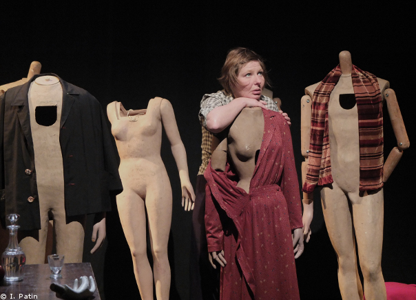 Ella raconte. Elle n’est pas travestie. Elle est une femme qui dit sa vérité. Elle raconte son histoire, son secret, un soir, chez elle, à d’étranges mannequins. Ces présences atemporelles sont la mémoire de son corps, comme autant d’images fragmentaires d’elle au passé. Elle les déplace, les manipule, les répare, les habille. L’espace est clos, son intérieur devient le lieu de son intériorité, où elle peut tendre des miroirs, devant elle ou devant des images d’elle. Elle parle, sur des notes d’accordéon qui joue dans sa tête, comme une mélodie du dedans, accompagnant musicalement son introspection. Ces témoins silencieux de son récit nocturne, auront une présence en écho à la sienne, à toutes ces années où elle a vécu cachée. Qui est le fantôme ?