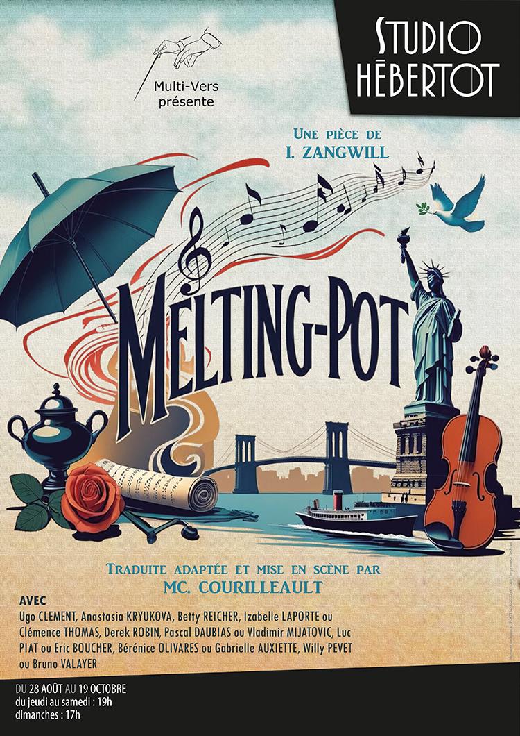 Belle idée que de nous faire découvrir cette pièce. J’ignorais que l’expression de « melting pot » pour désigner le creuset de peuple des États-Unis trouvait son origine dans le titre de cette œuvre. J’ai aussi découvert à cette occasion son auteur, l’écrivain britannique Israel Zangwill (qui fut aussi le fondateur du sionisme territorialiste). Dans « Melting pot », il loue les États-Unis comme nation nouvelle regroupant fraternellement des immigrants venus du monde entier et dépassant leurs différences – y compris religieuses - pour s’entendre. Cela me semble plus ressortir d’un manifeste volontariste que d’une version naïve de l’idéalisme. En effet, Zangwill est sans concession avec la bêtise antisémite de certains milieux d’affaires américains. Outre le plaidoyer pour la fraternité et la dénonciation de l’antisémitisme (notamment en Russie et aux États-Unis), Zangwill rend aussi ici un bel hommage à l’âme tourmentée des artistes et à la force de l’amour. C’est bien mis en scène et bien joué, avec une mention spéciale pour les moments musicaux, qu’il s’agisse des chants, en yiddish et en anglais, ou des passages où Ugo Clément joue du violon.