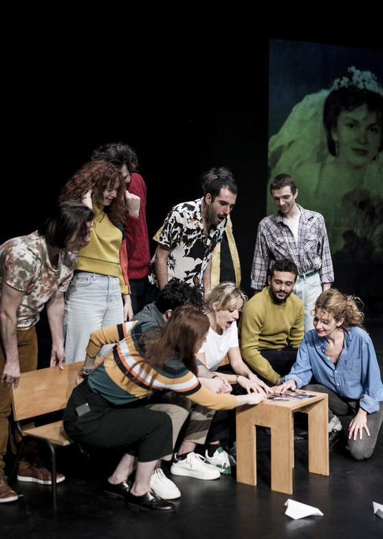 Le metteur en scène interroge les notions de transmission entre deux générations, de mémoire et d’héritage, contre ou avec lequel on se construit. Au travers de photos de mariage, de messages téléphoniques ou encore d’anecdotes de vie s’édifie une pièce chorale qui dépeint la réalité de la relation parents-enfants d’aujourd’hui. Sur un plateau quasi nu, les élèves de la promotion 10 de l’école du TNB ne se contentent pas de décrire et de raconter ceux qui les ont élevés. Ils les incarnent aussi, les caricaturent parfois, portant sur eux un regard tendre et cruel. Leurs confidences nous touchent avec légèreté et justesse.